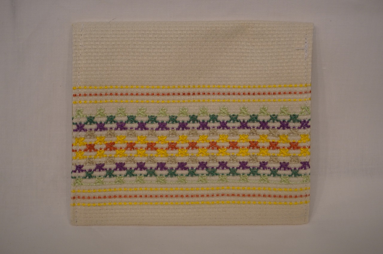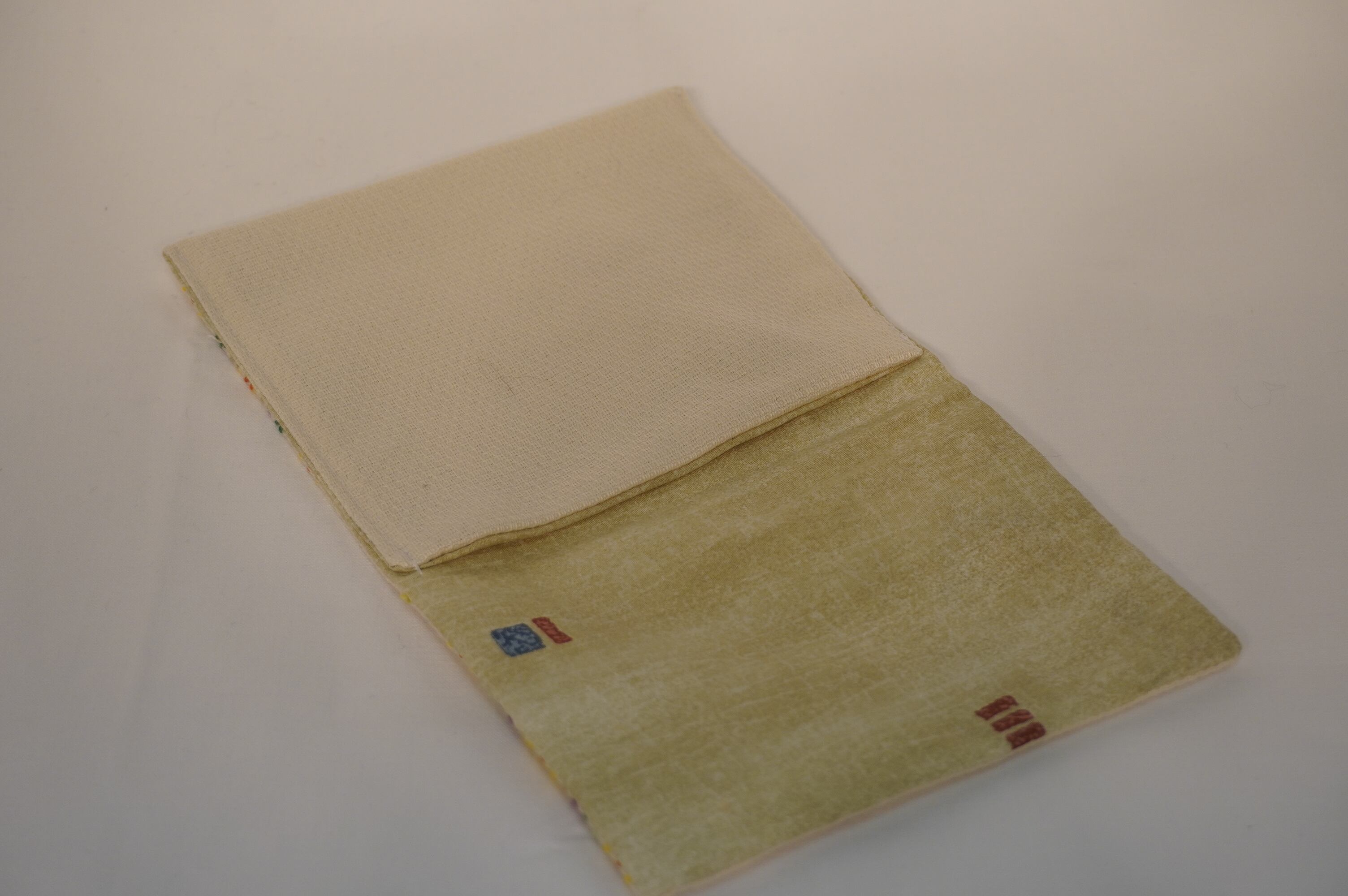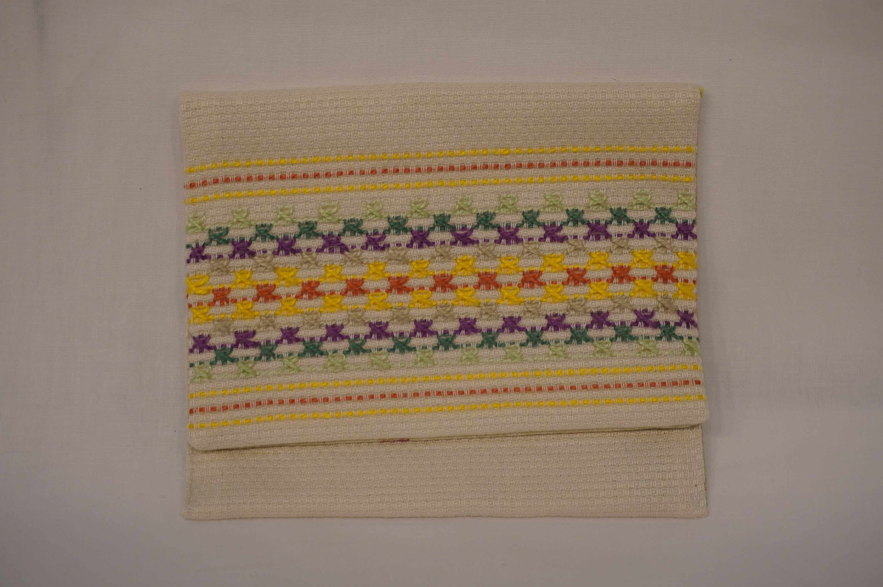 生成り色の生地に、黄色や緑、紫がアクセントになっています。
