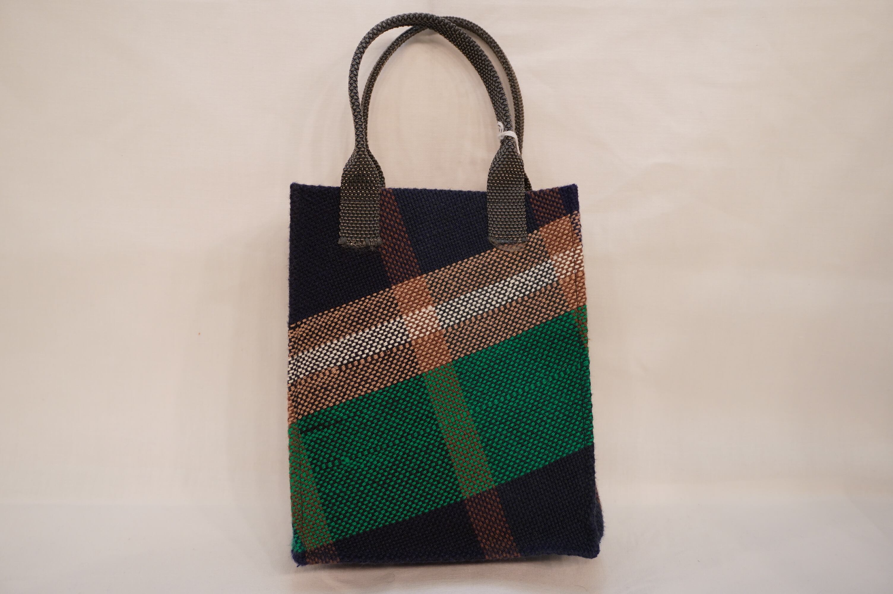 商品説明:さをり織で作ったミニトートバッグです。男性でも持っていただける色味となっております。