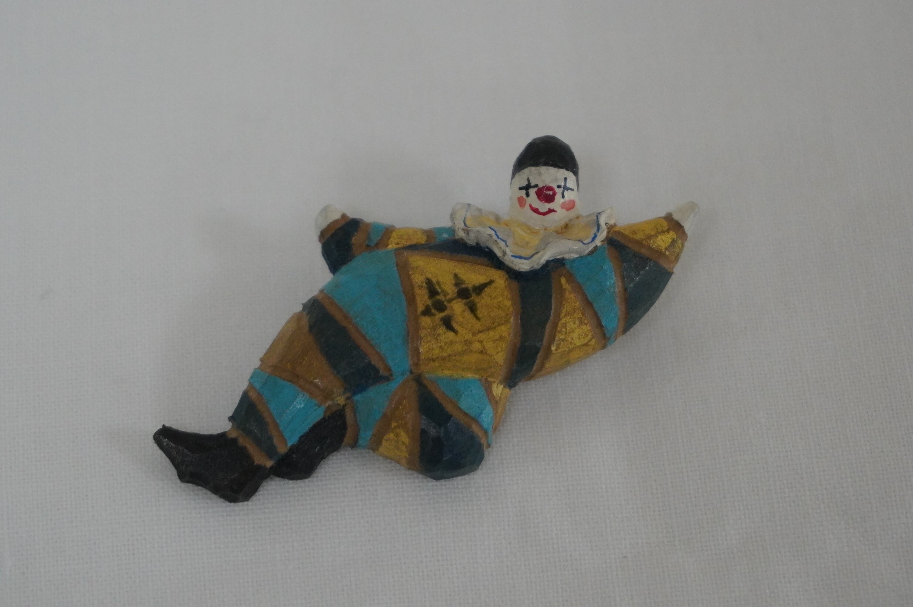 商品説明:作家が大好きなピエロのブローチ。木でできています。一点一点手彫りで制作し、色を塗っています。